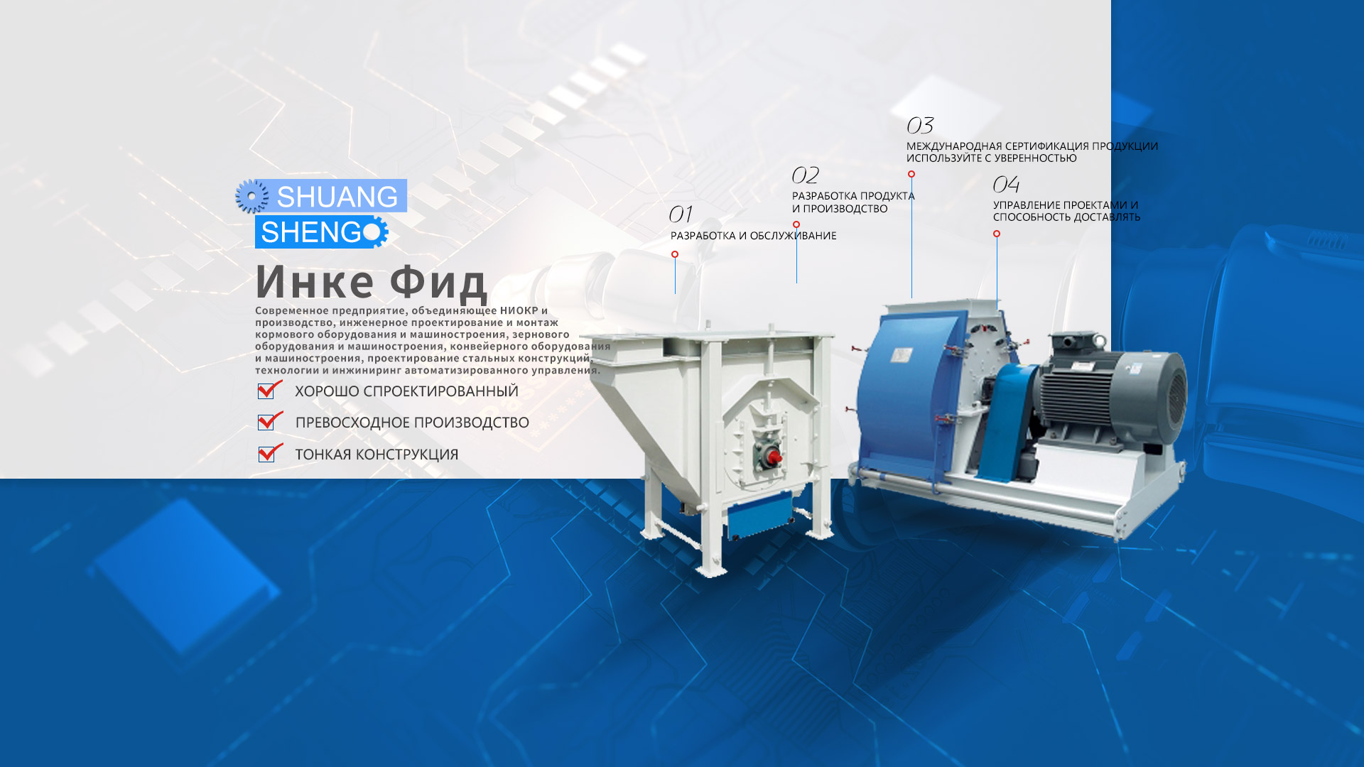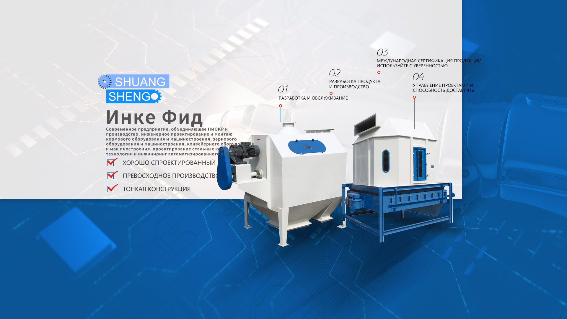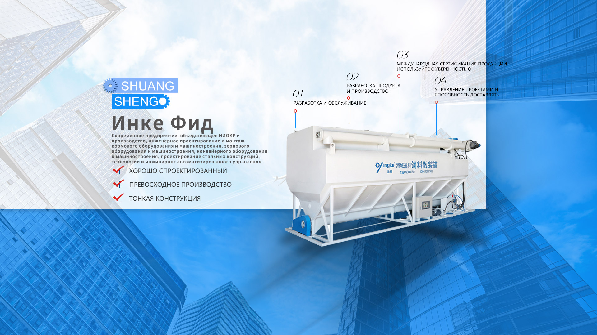 Компания Haicheng Yingke Feed Machinery Manufacturing Co., Ltd. была основана в 2008 году. После тринадцати лет развития и роста она превратилась в модернизированную компанию, объединяющую разработку и производство продукции, инженерное проектирование и монтаж кормового оборудования и техники, зерновой техники и техники, конвейерного оборудования и техники, проектирования стальных конструкций, технологии автоматического управления и инженерии. предприятие. Компания полностью прошла сертификацию системы менеджмента качества ISO9001-2008, сертификацию системы 3C для производства электроприборов и т. д.
